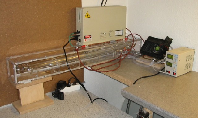 Meine kleine Laserecke. Die Röhre habe ich in ein Plexiglasgehäuse gebaut.